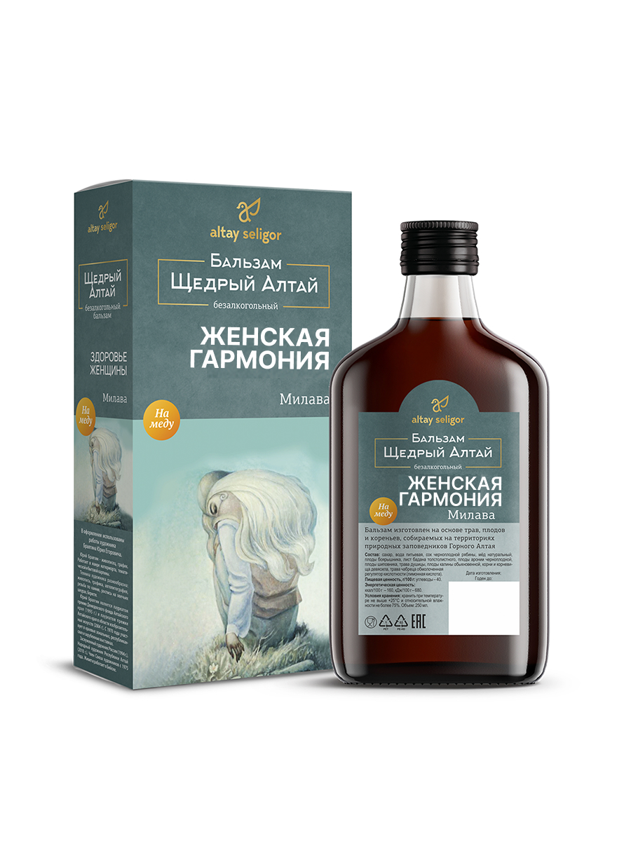 Алтайский бальзам на травах рекомендуется при женских воспалениях. Безалкогольный бальзам оказывает мягкое оздоровительное воздействие на женский организм и укрепляет нервную систему, помогает при дискомфортных проявлениях климакса.