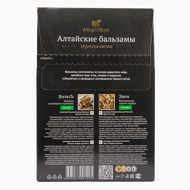 Сироп (сахар, вода питьевая), колер (сахар, вода питьевая), морс из растительного сырья (вода питьевая, корни и корневища копеечника чайного (красного корня), плоды рябины обыкновенной, корневища аира, корни и корневища родиолы розовой, лист бадана толстолистного, корни и корневища девясила, орех кедровый, имбирь), сок черноплодной рябины (аронии), мед, регулятор кислотности (лимонная кислота).