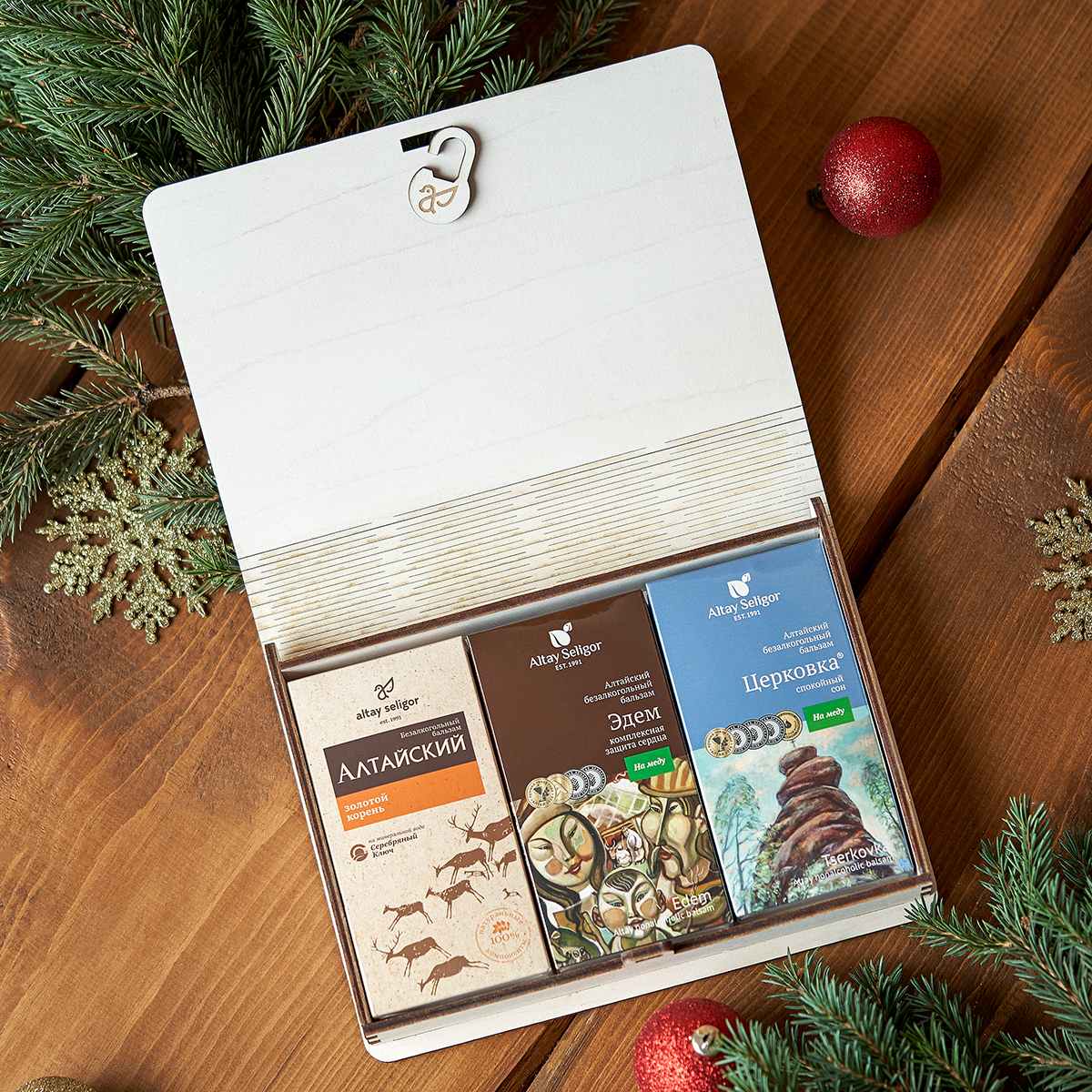 В состав подарочного набора входят 3 популярных бальзама, которые изготовлены на основе душистого меда, целебных трав, ягод плодов и кореньев, собираемых в экологически чистом Алтае: